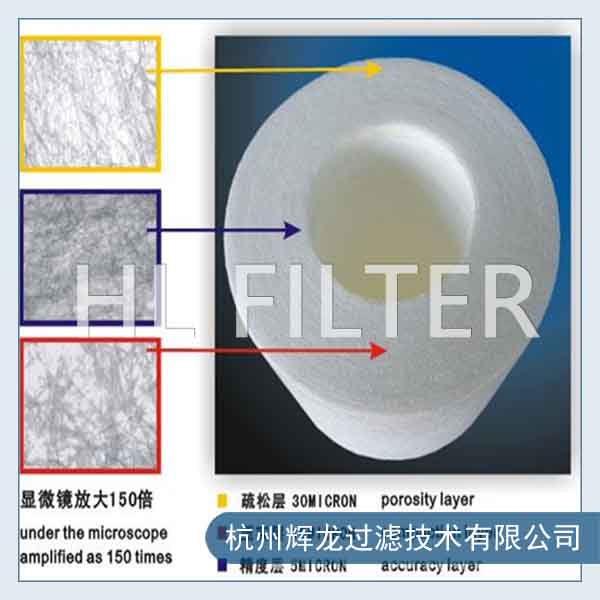 PP棉濾芯采用無毒無味的聚丙烯粒子,經(jīng)過加熱熔融、噴絲、牽引、接受成形而纏繞粘結(jié)的管狀濾芯。過濾最高精度可達(dá)1μm,濾芯的結(jié)構(gòu)由外向內(nèi)層級(jí)過濾,越靠近濾芯里層,孔徑越小,過濾的精度也越高。PP棉具有流量大、耐腐蝕耐高壓低成本等特點(diǎn),主要用于阻擋水中的鐵銹、泥沙、懸浮物等大顆粒物質(zhì)。